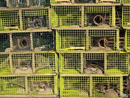 Lobster traps stacked on the wharf in Caribou.