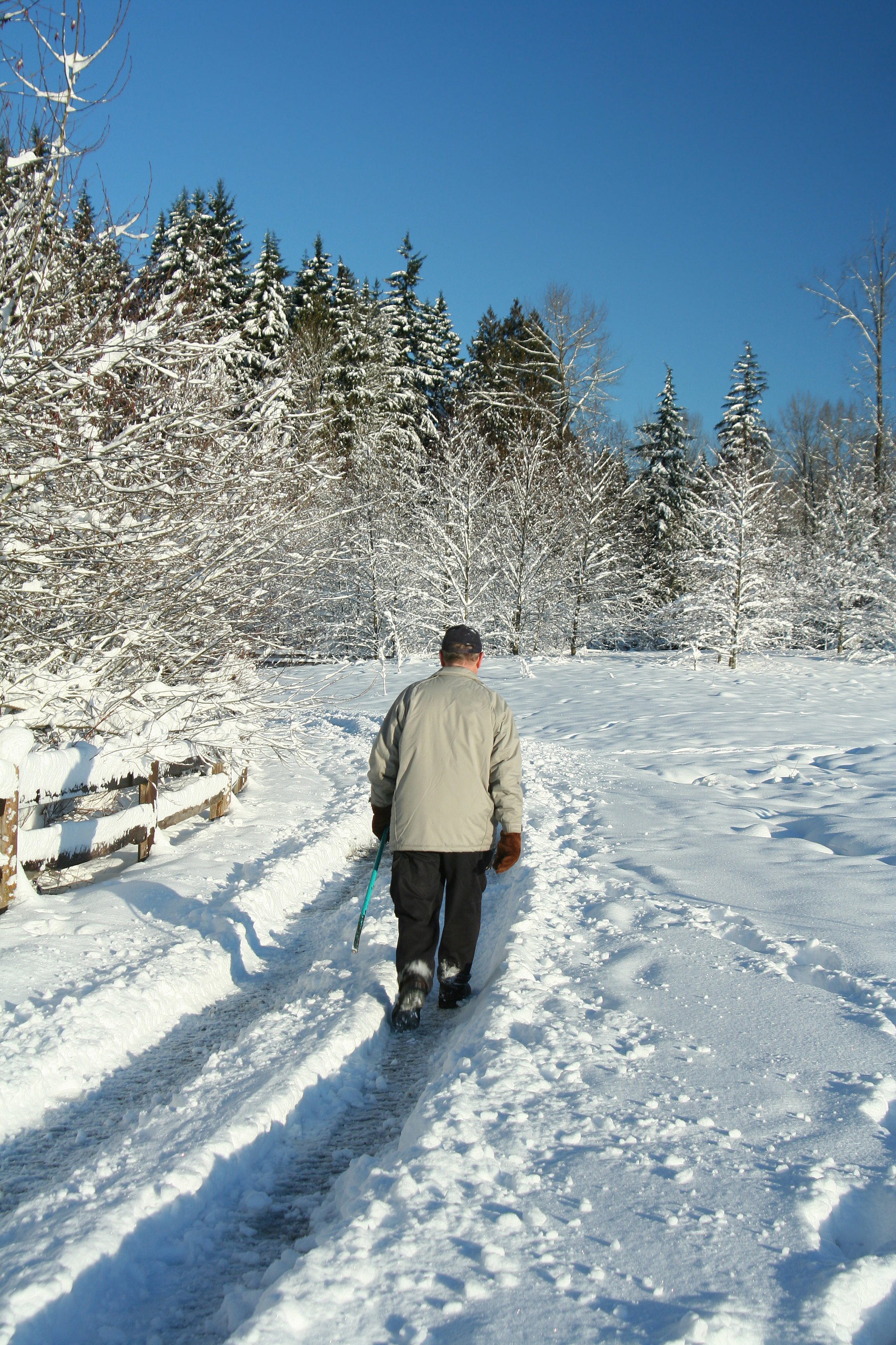 Elderly gentleman walking alone through a snow covered park.
