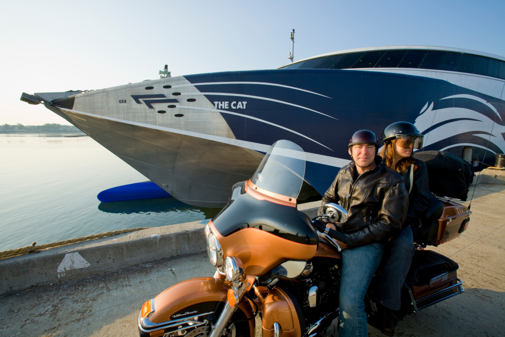 You can take your motorbike on the Cat Ferry.